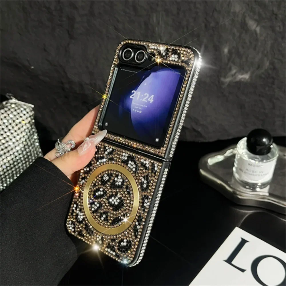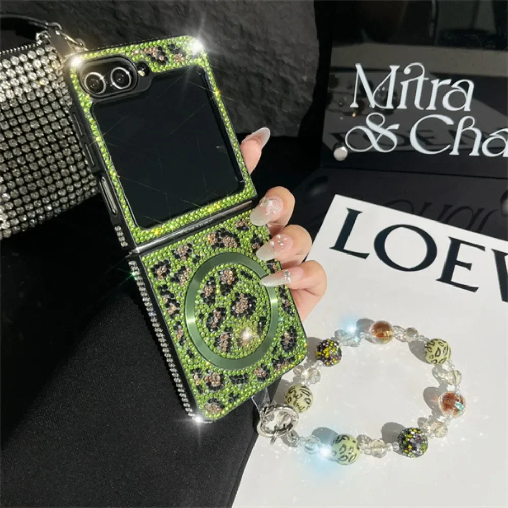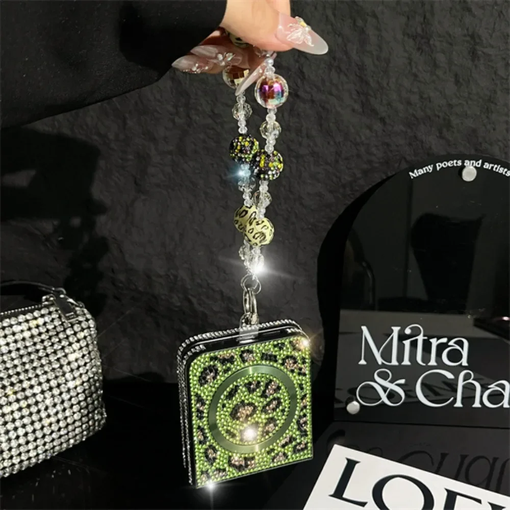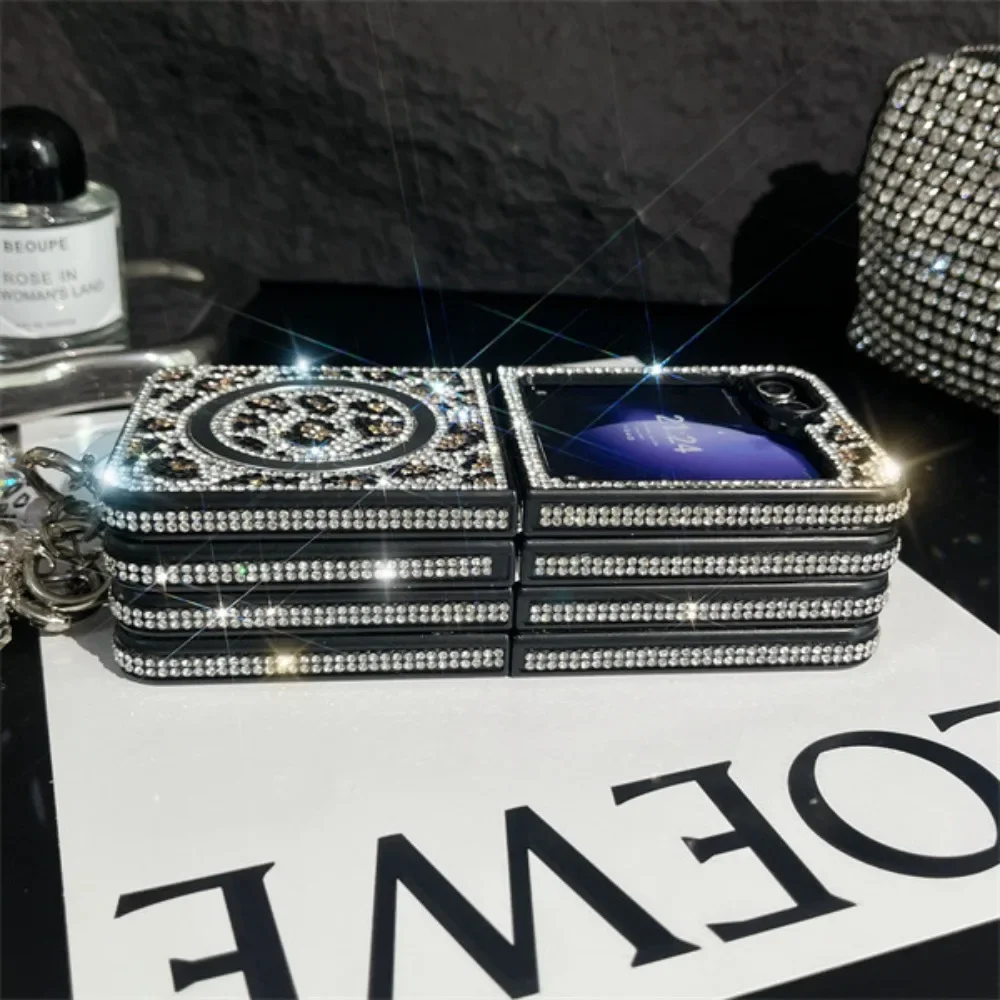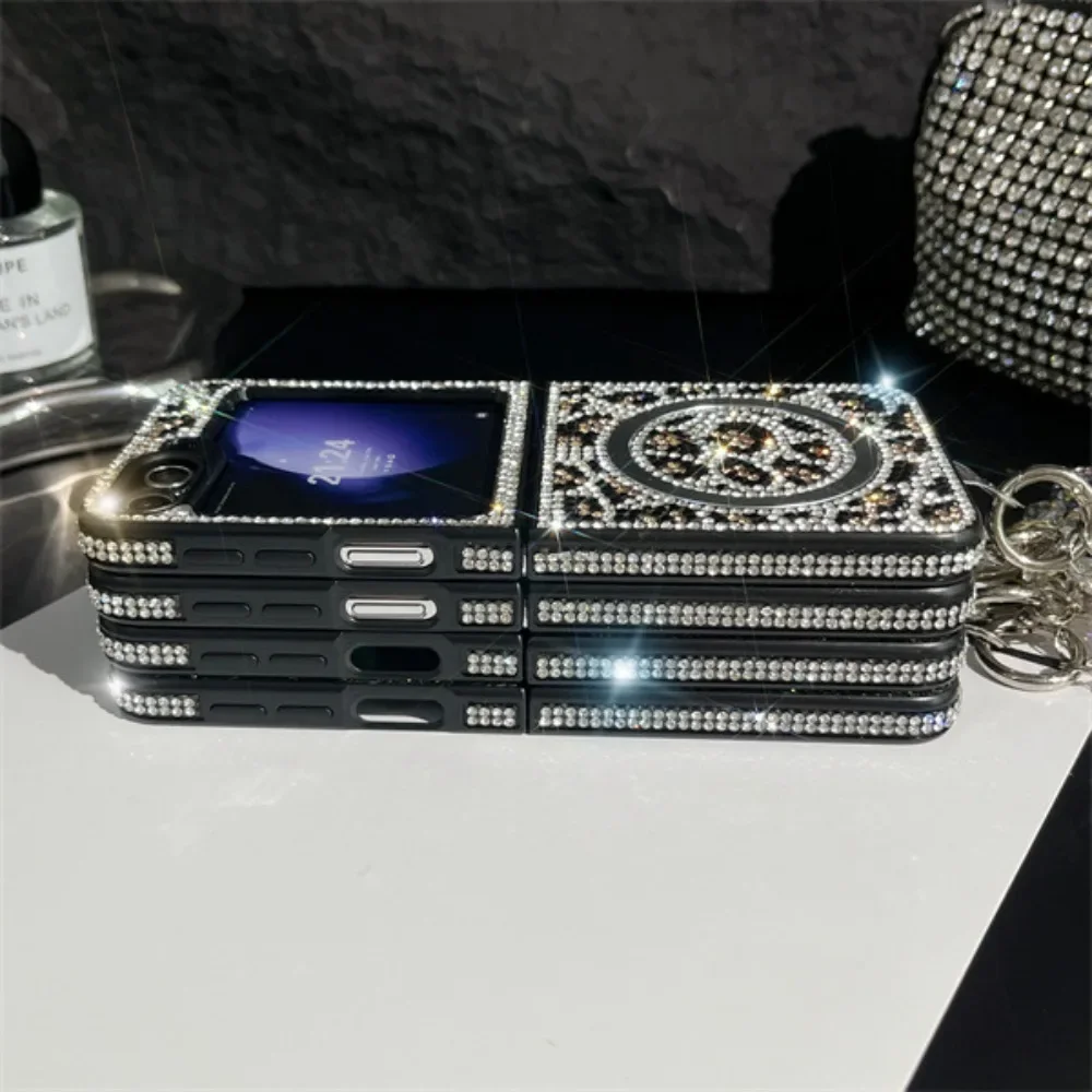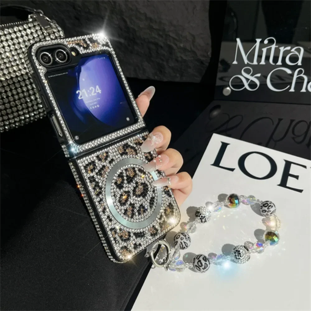 Coque de téléphone magnétique en cuir imprimé léopard, paillettes scintillantes, strass, chaîne à main, dragonne pour Samsung Galaxy Z Flip 6 5 4 3 5G