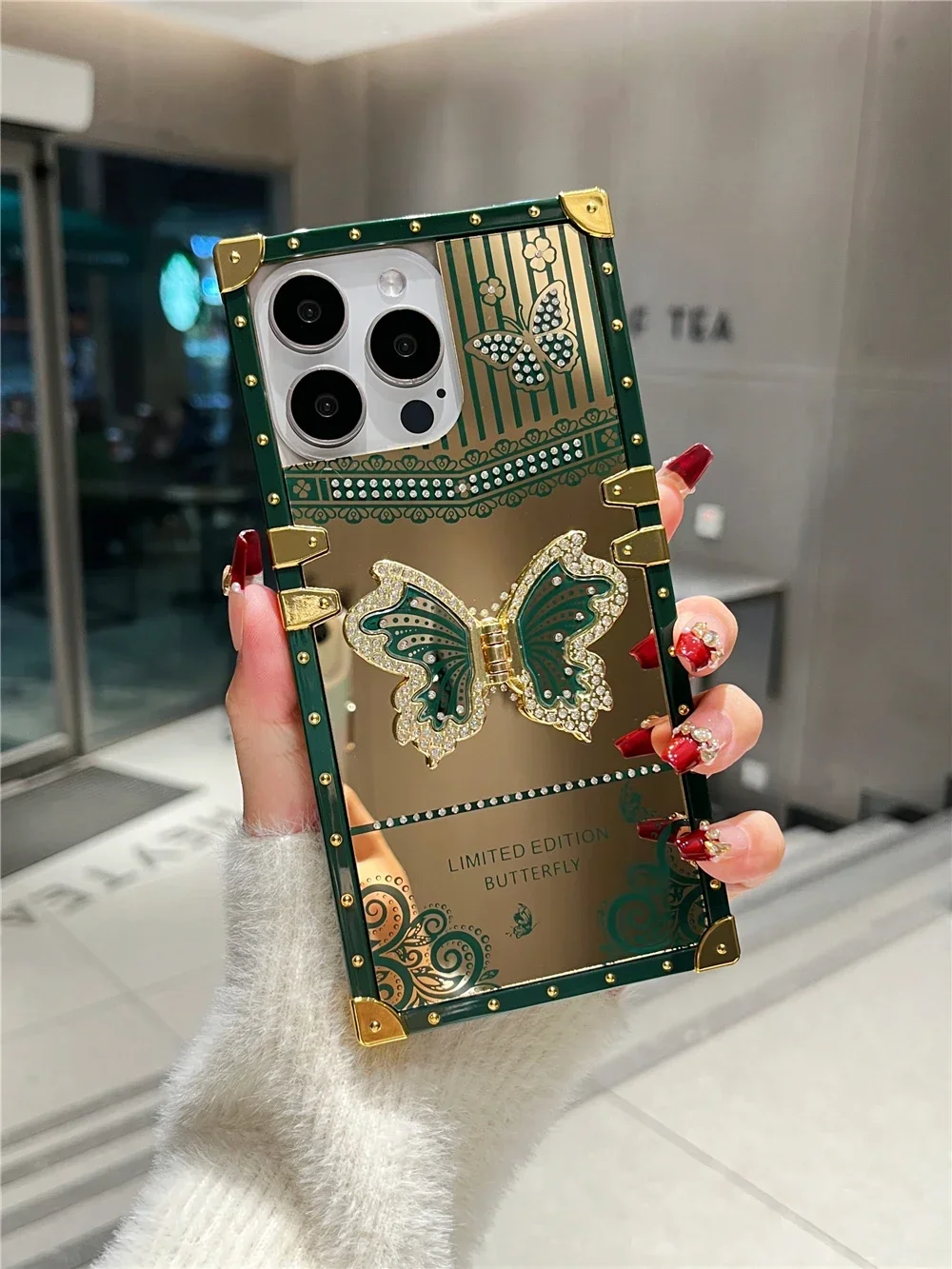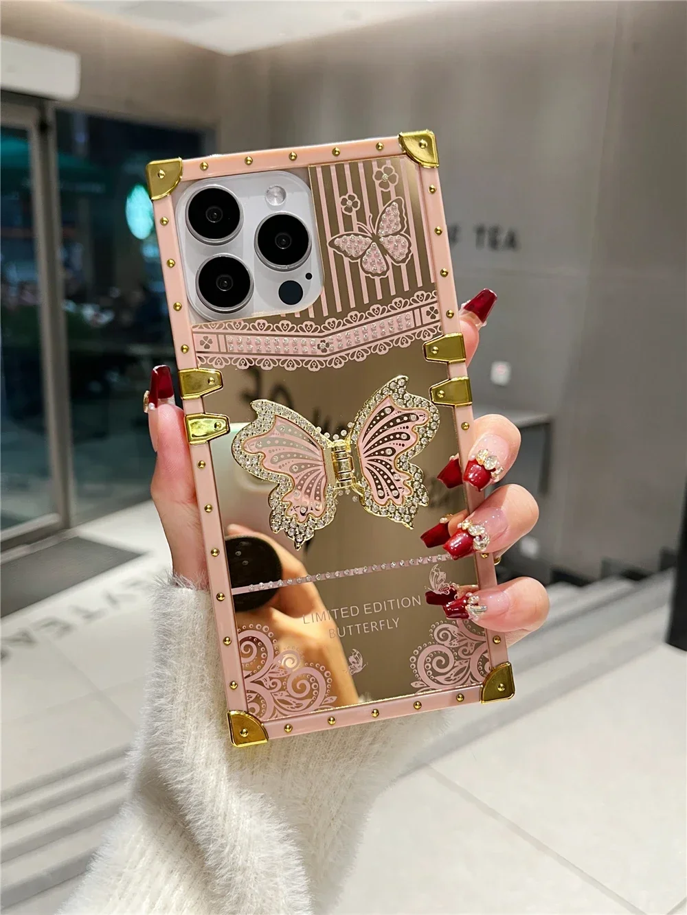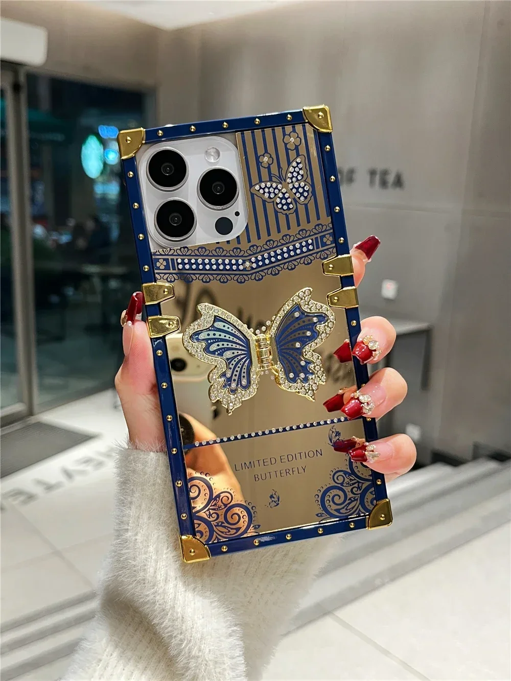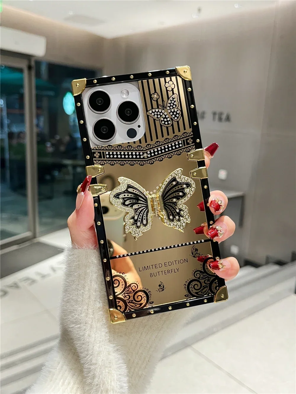 Coque de téléphone miroir mignonne pour iPhone 16 15 14 Plus 13 12 11 Pro Max, housse de support pliable de luxe à paillettes papillon