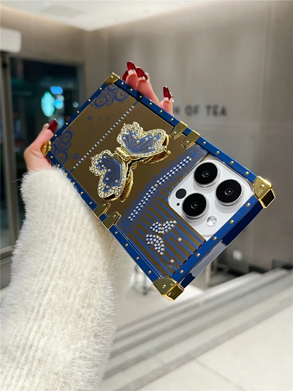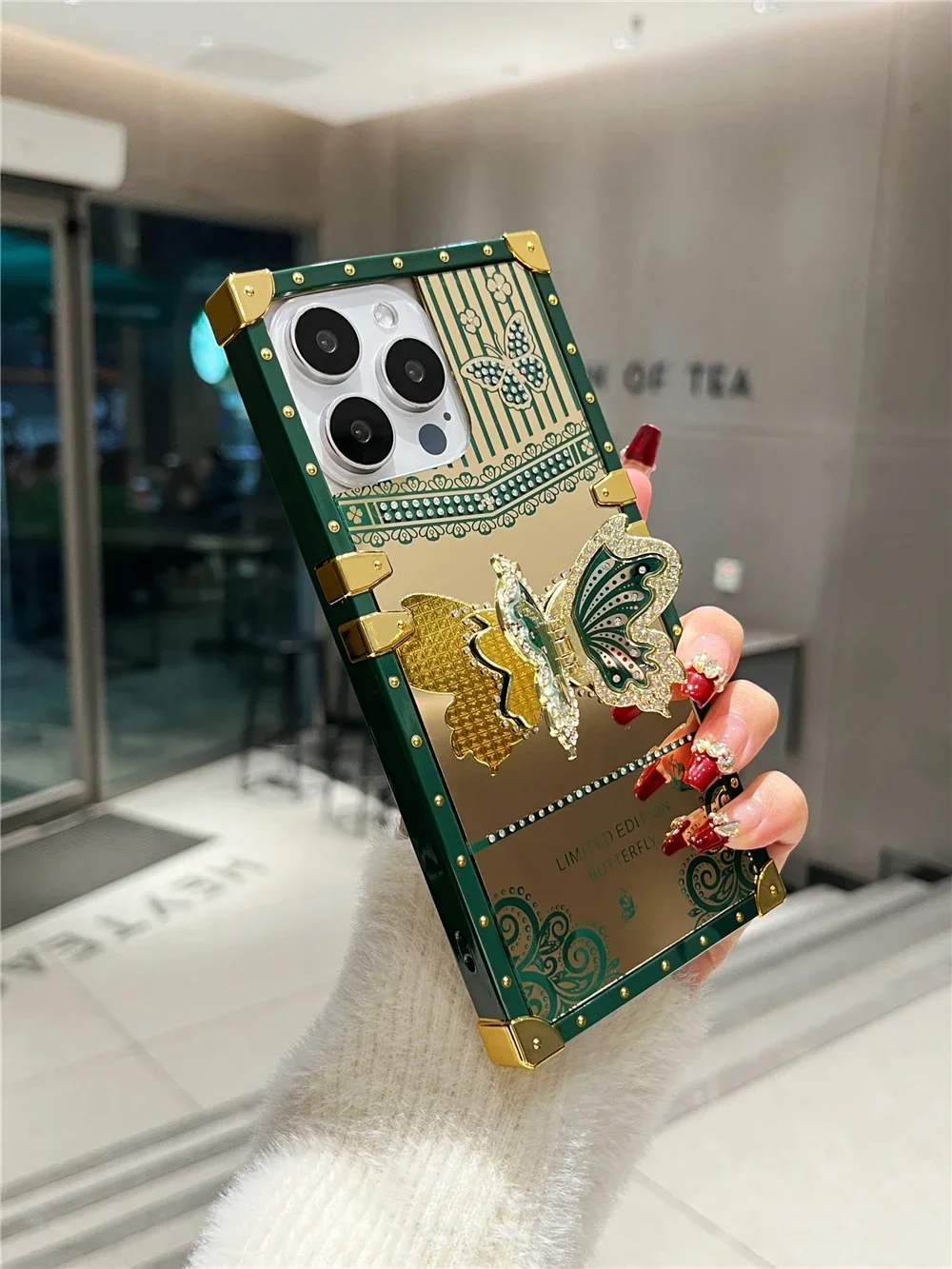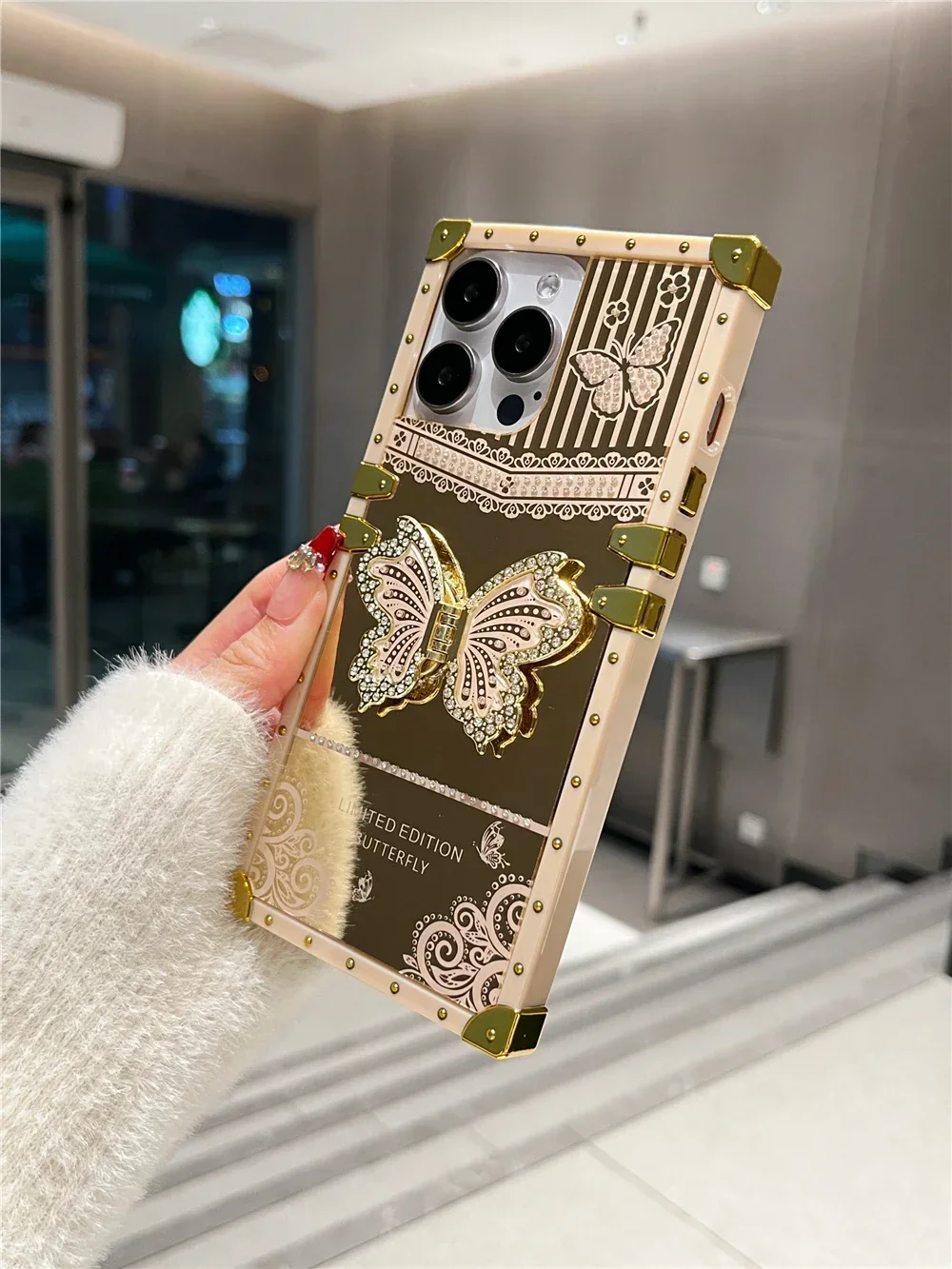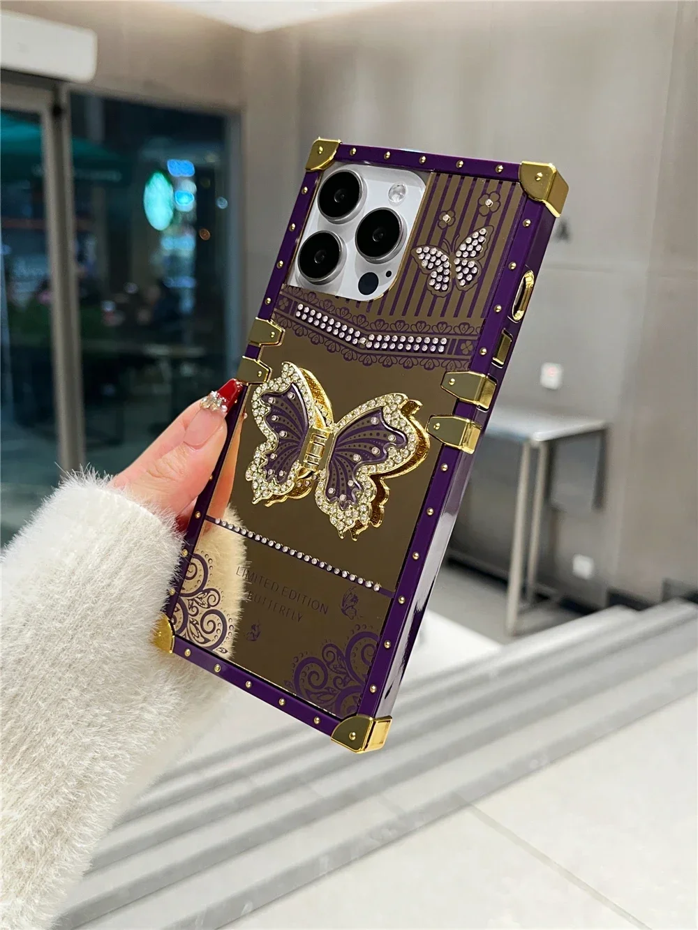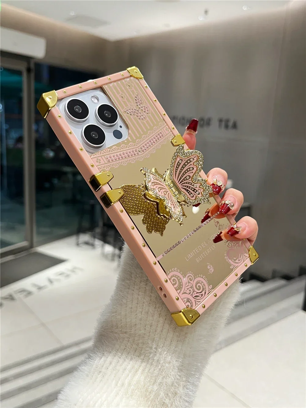 Coque de téléphone miroir mignonne pour iPhone 16 15 14 Plus 13 12 11 Pro Max, housse de support pliable de luxe à paillettes papillon