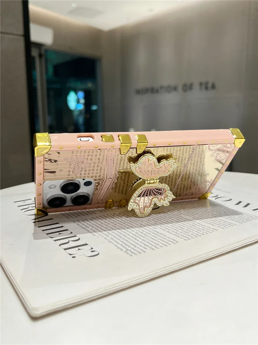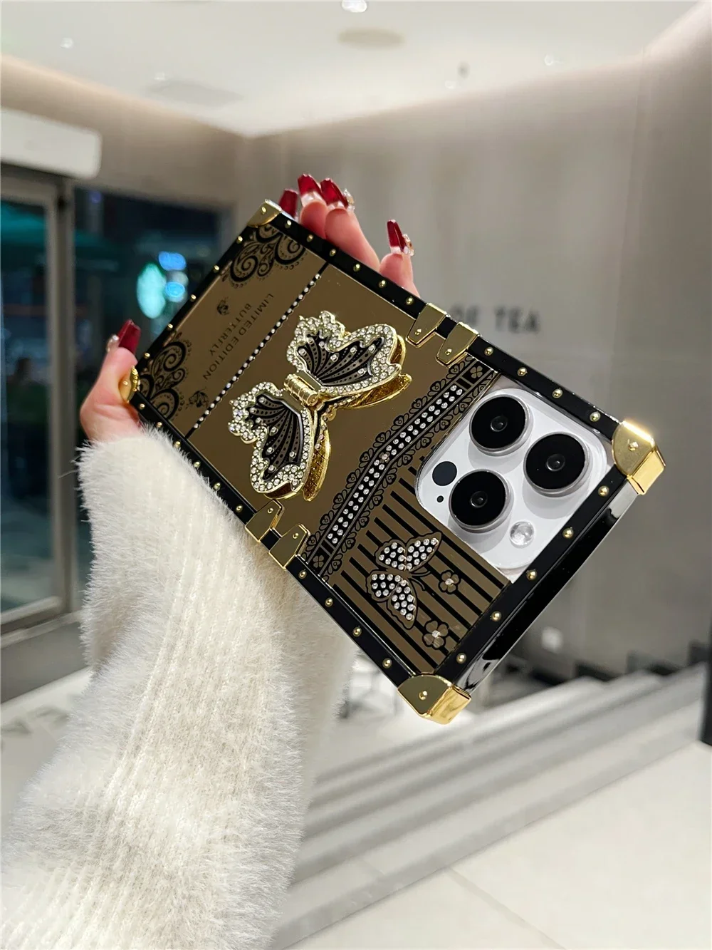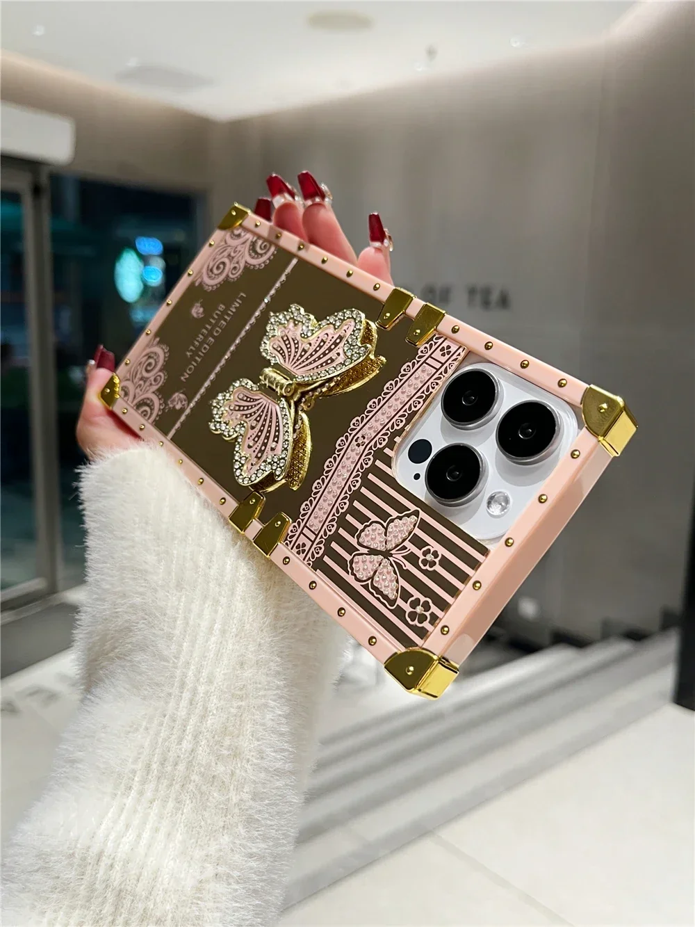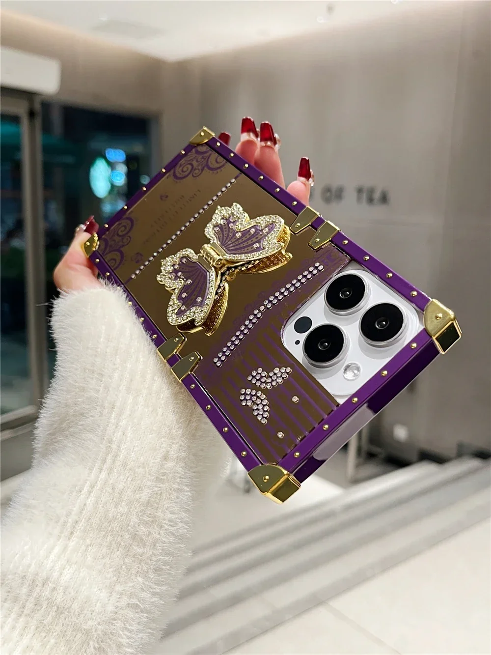Coque de téléphone miroir mignonne pour iPhone 16 15 14 Plus 13 12 11 Pro Max, housse de support pliable de luxe à paillettes papillon