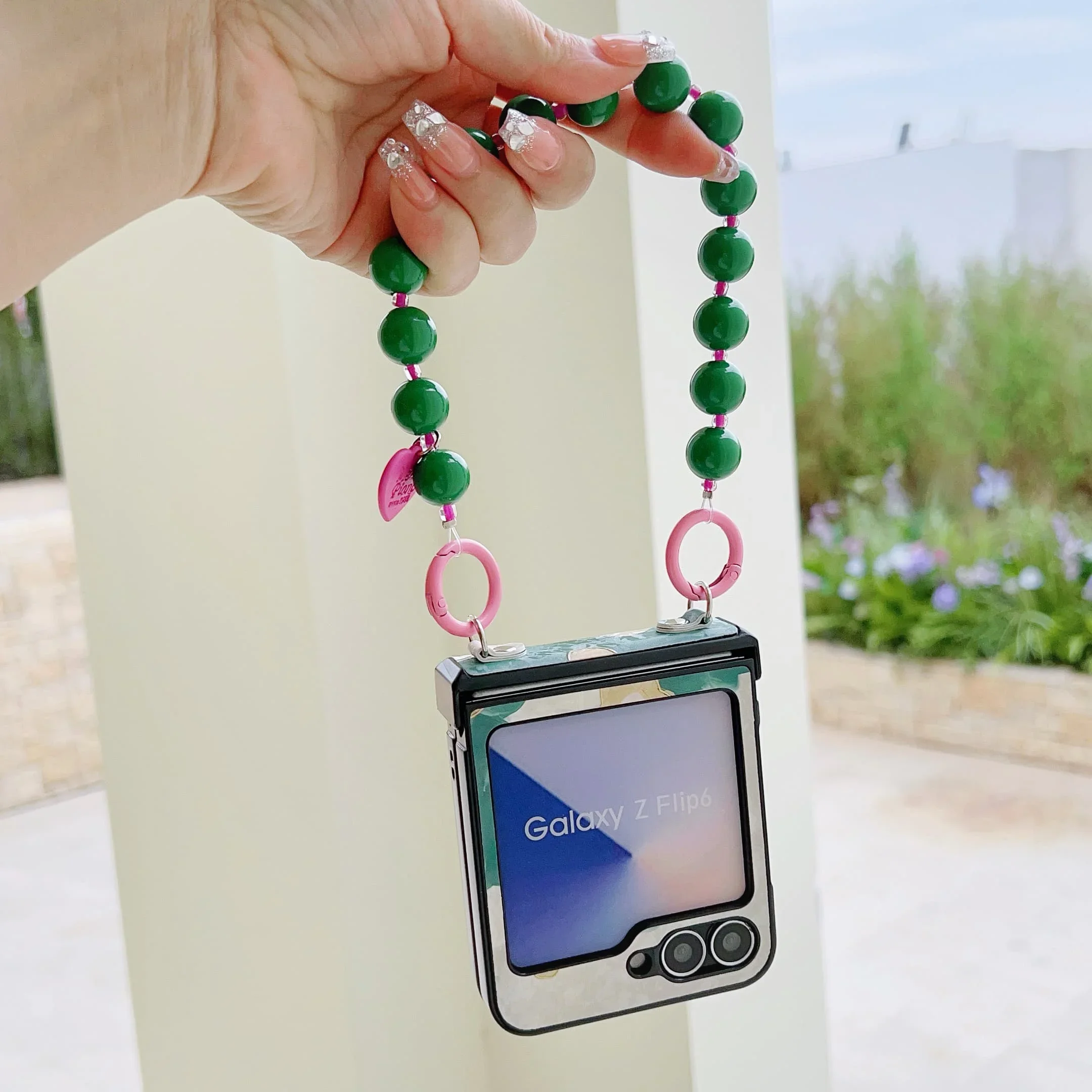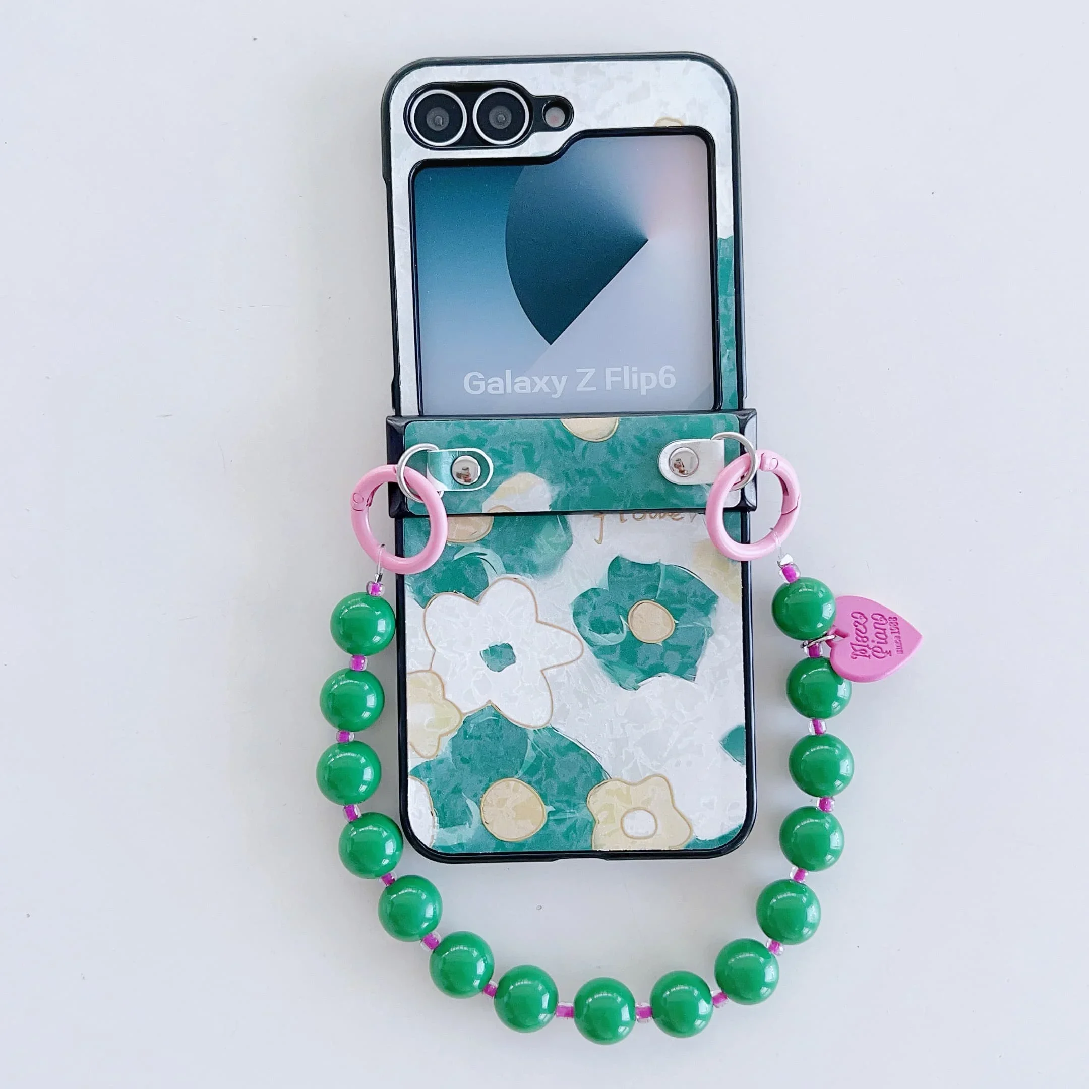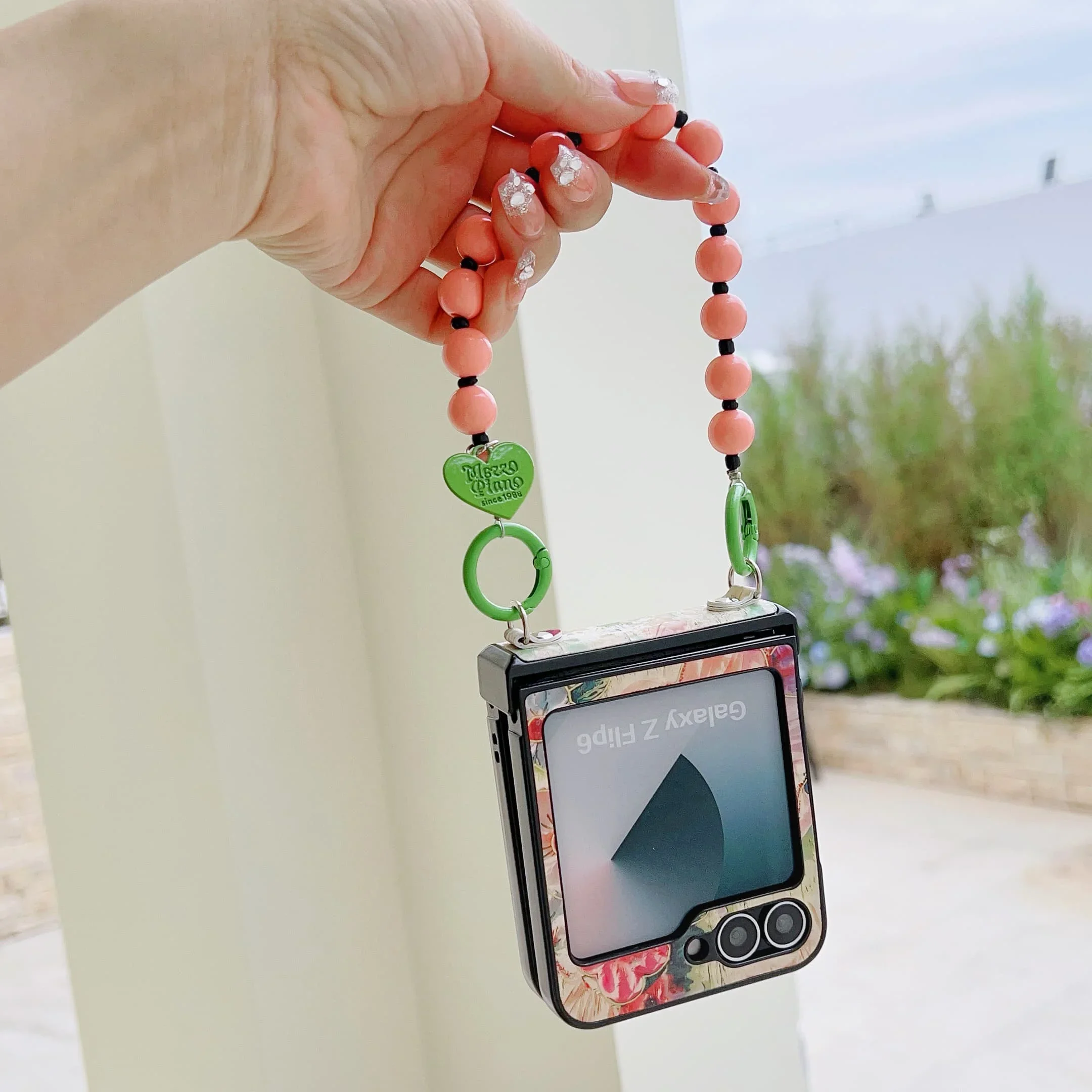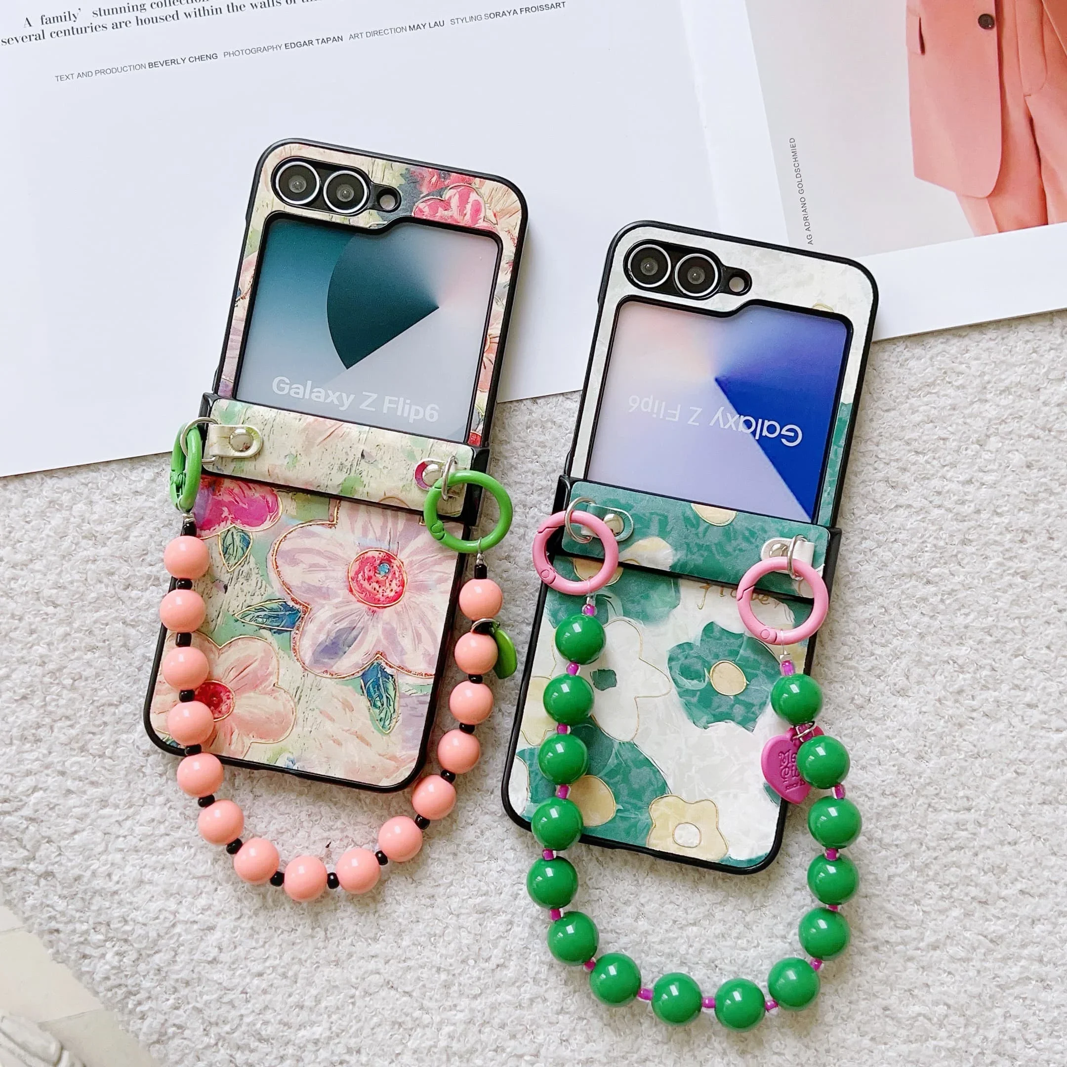 Housse en cuir PU fleur avec Protection de charnière et Bracelet de chaîne de poignet pour Samsung Galaxy Z Flip 6 5 4 3, étui de téléphone