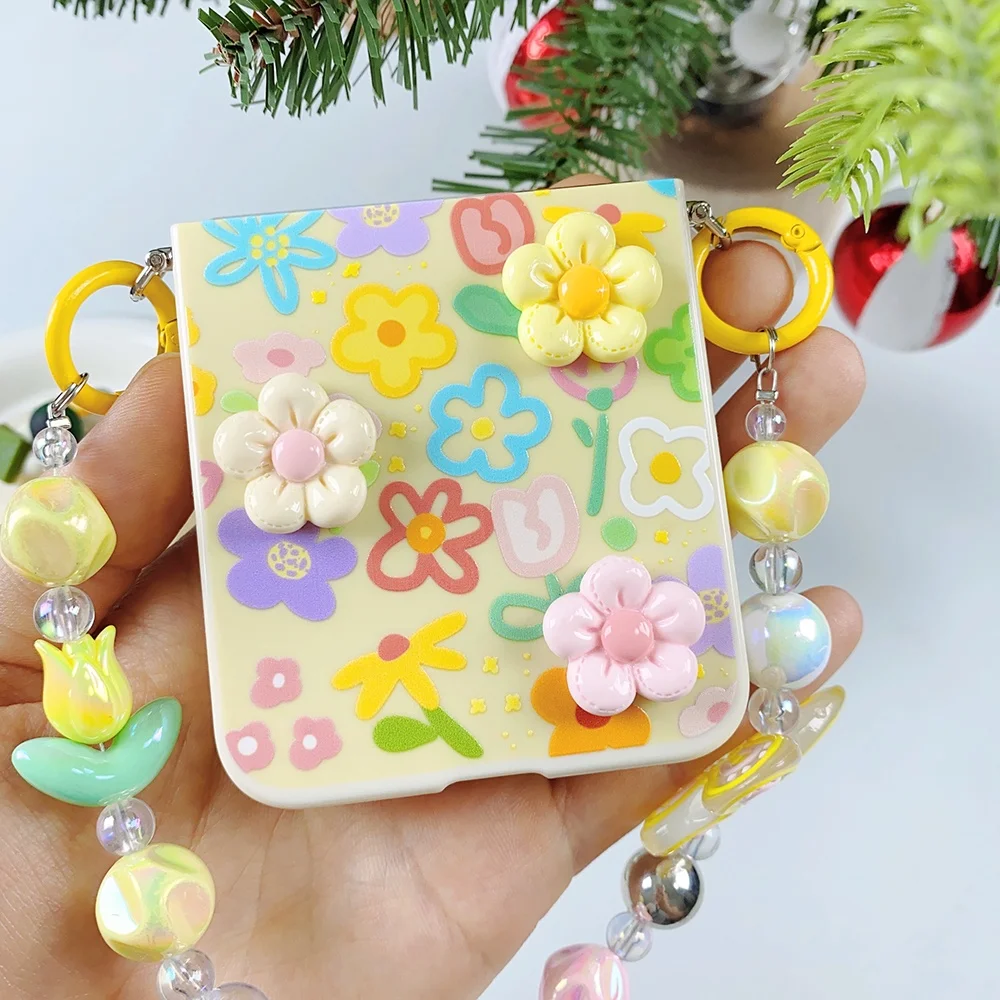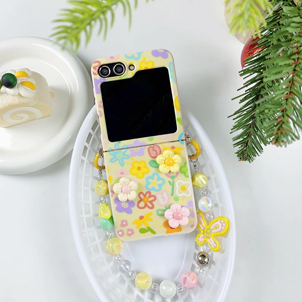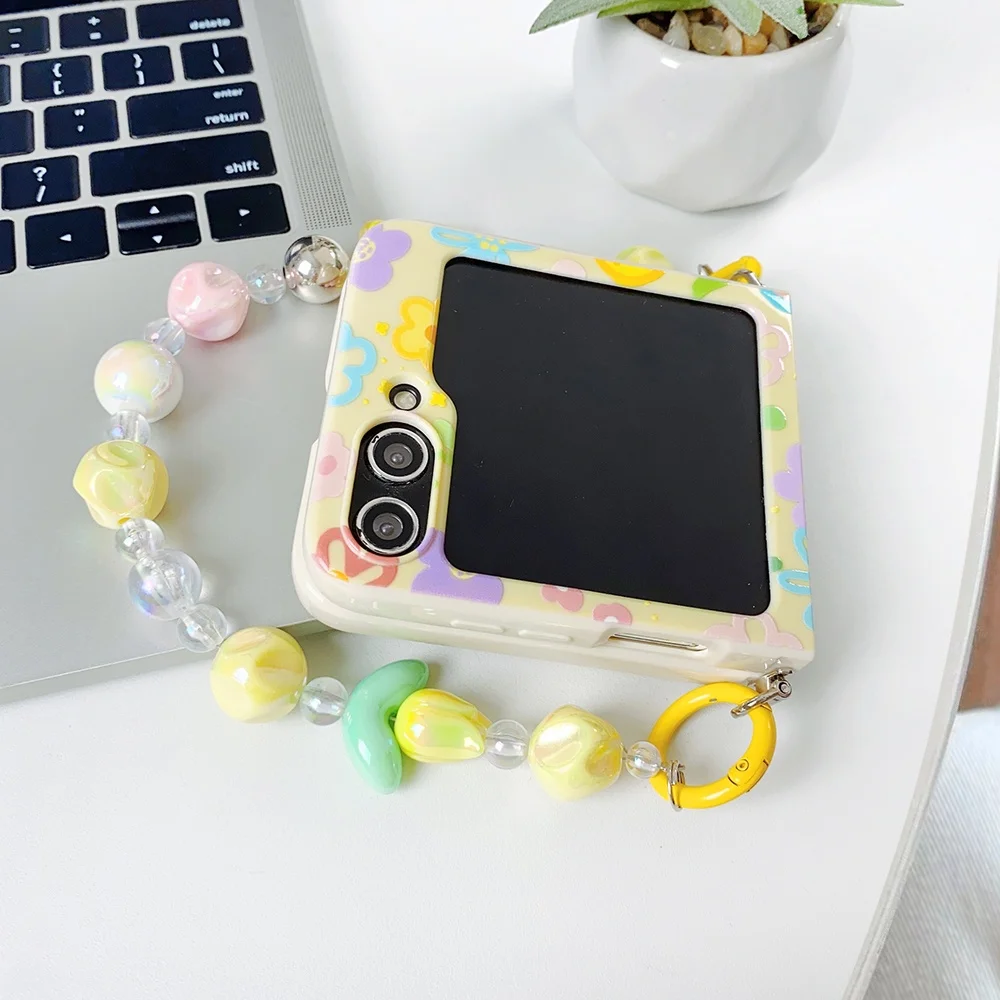 Étui avec Bracelet à fleurs 3D, dessin animé mignon, pour Samsung Galaxy Z Flip 6 5 4 3 Flip6, perles colorées, chaîne de poignet, housse souple antichoc