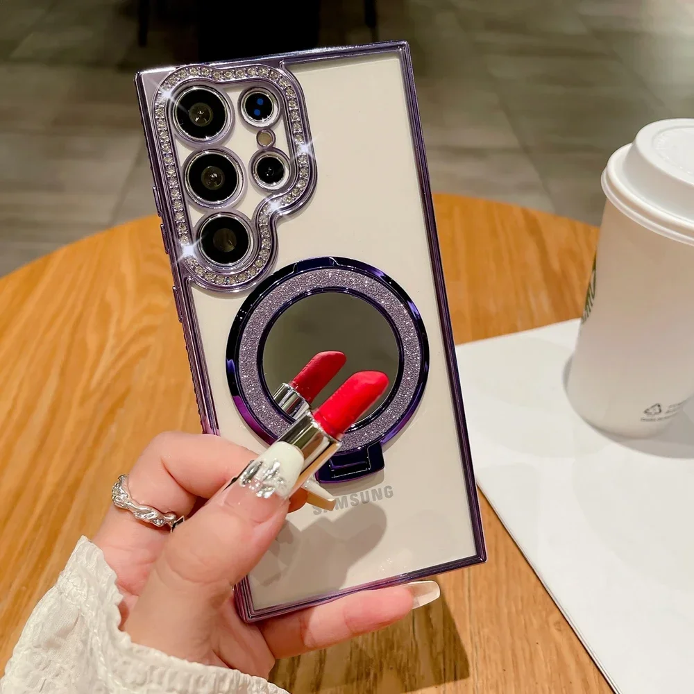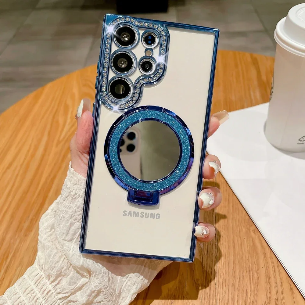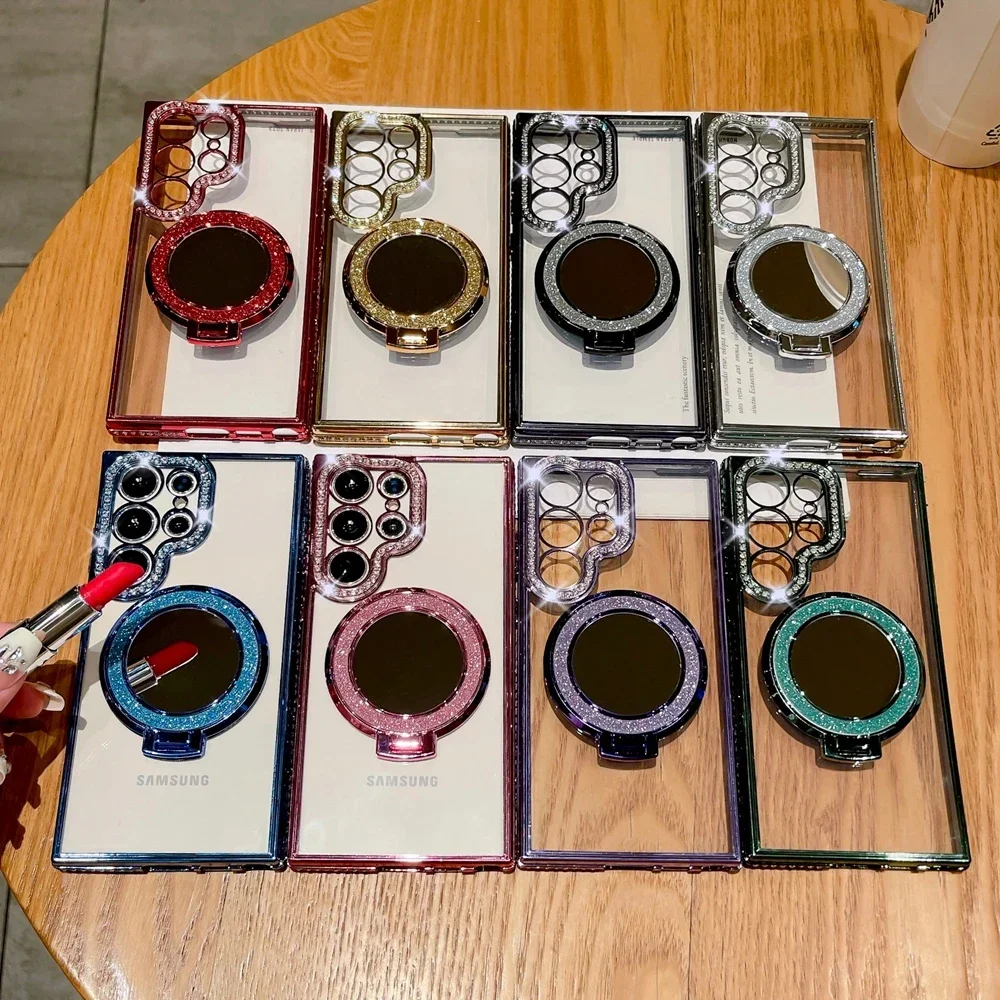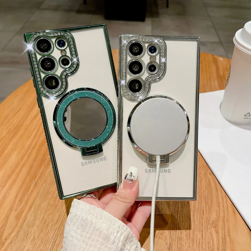 Étui Magsafe transparent plaqué diamant de luxe pour Samsung Galaxy S25 S24 S23 Ultra S22, support de paillettes miroir, housse antichoc